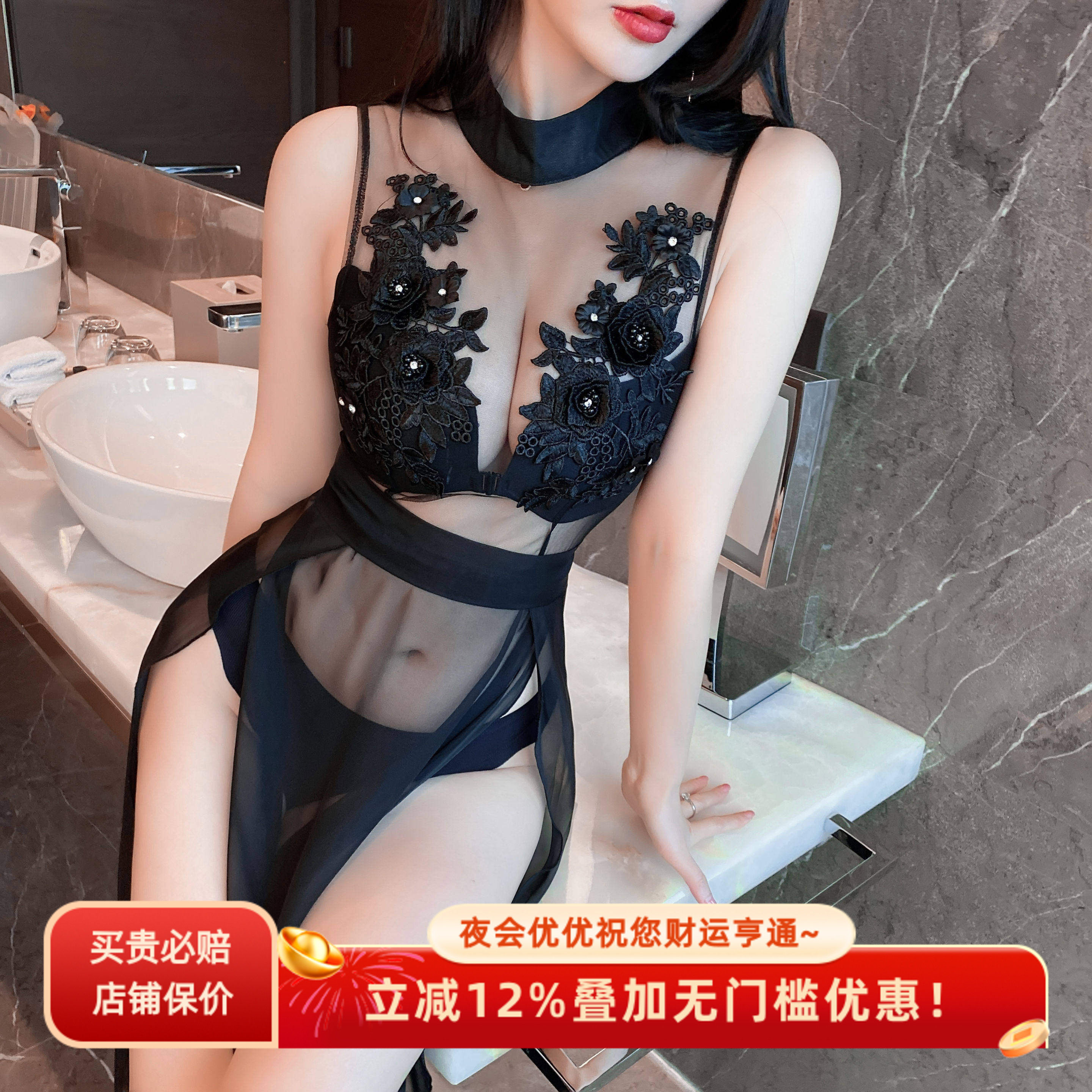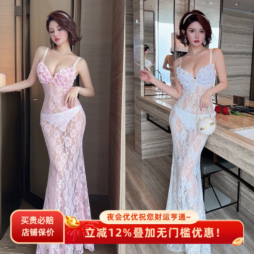 25新款透视蕾丝吊带长裙手工钻花低胸聚拢罩杯性感礼服裙夜场女装