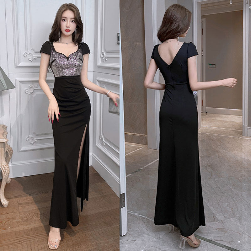 高端晚礼服夜场女装低胸显瘦开叉连衣裙性感网纱透视长裙沐足工衣