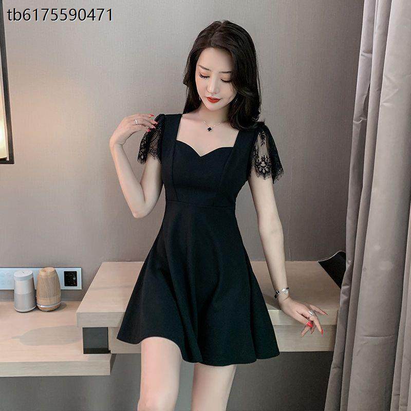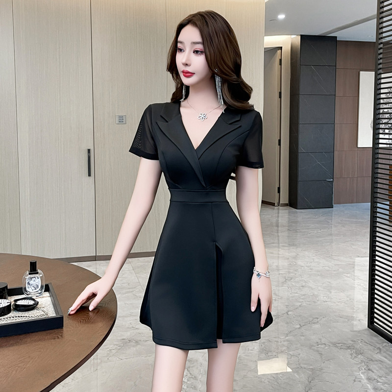 高级感透明气质修身短袖夜场女装黑色长裙子连衣裙上班服桑拿酒店