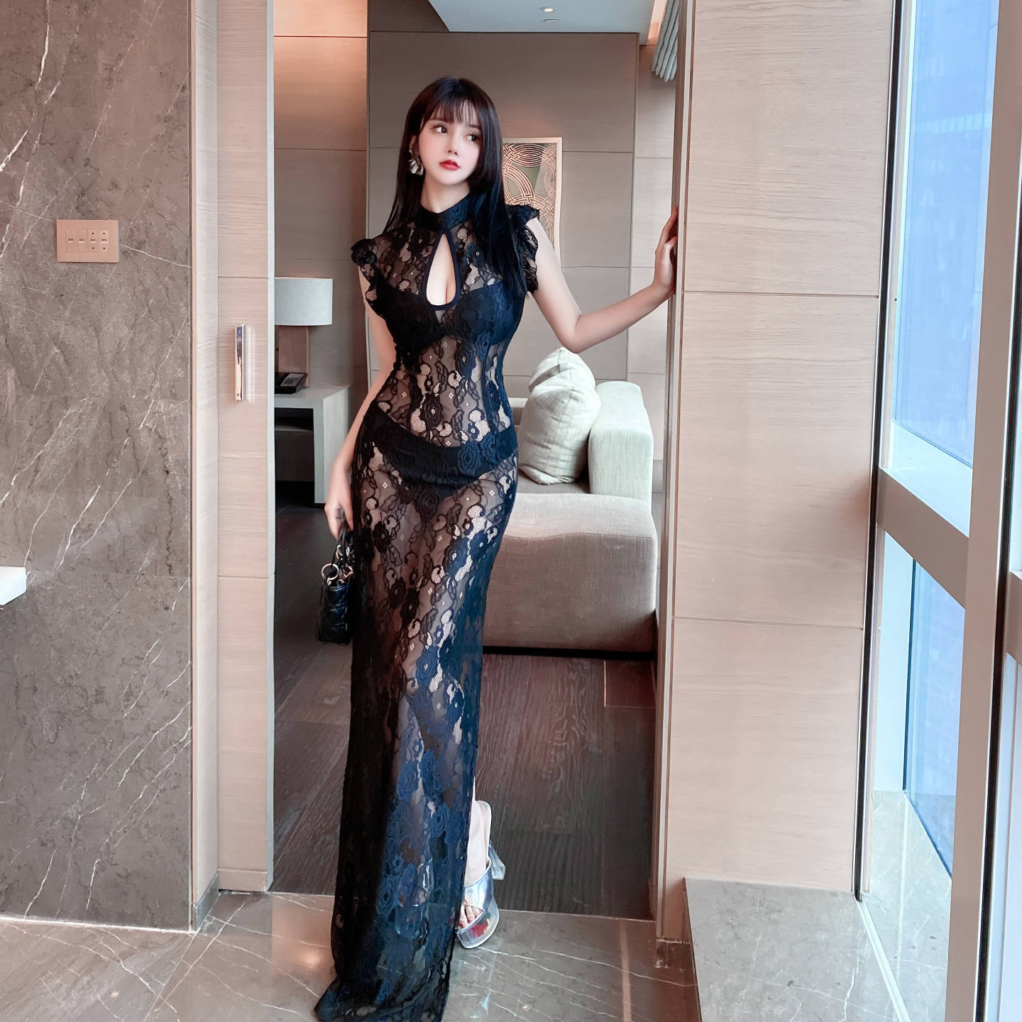 新款气质夜总会礼服酒店KTV修身长裙夜场女装透视蕾丝性感连衣裙