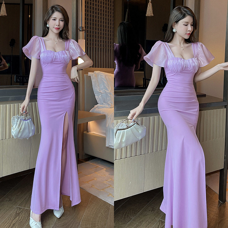 性感深V晚礼服长款 宴会高贵优雅紫色丝绒短袖鱼尾礼服裙夜场女装