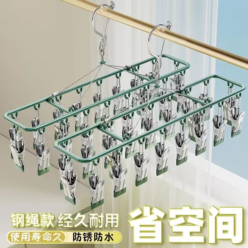 不锈钢晾衣架实心衣架多夹防风袜架晒衣服架阳台晒袜架多功能挂钩