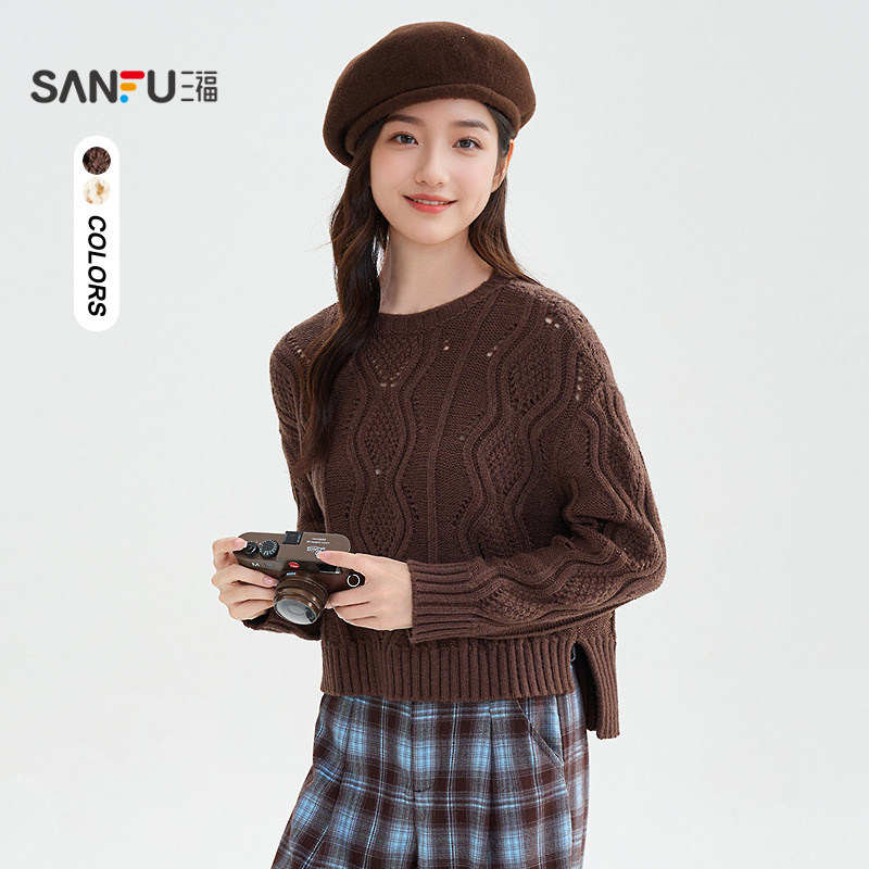 三福毛衣2025新款冬季开叉摆镂空麻花纹理短款套头上衣女装510277