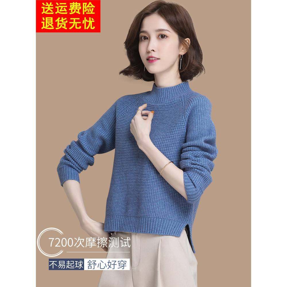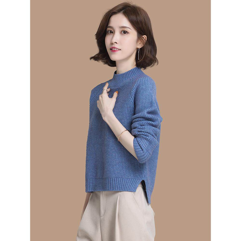 秋冬短款毛衣女时尚下摆开叉设计韩版针织衫宽松半高领针织打底衫