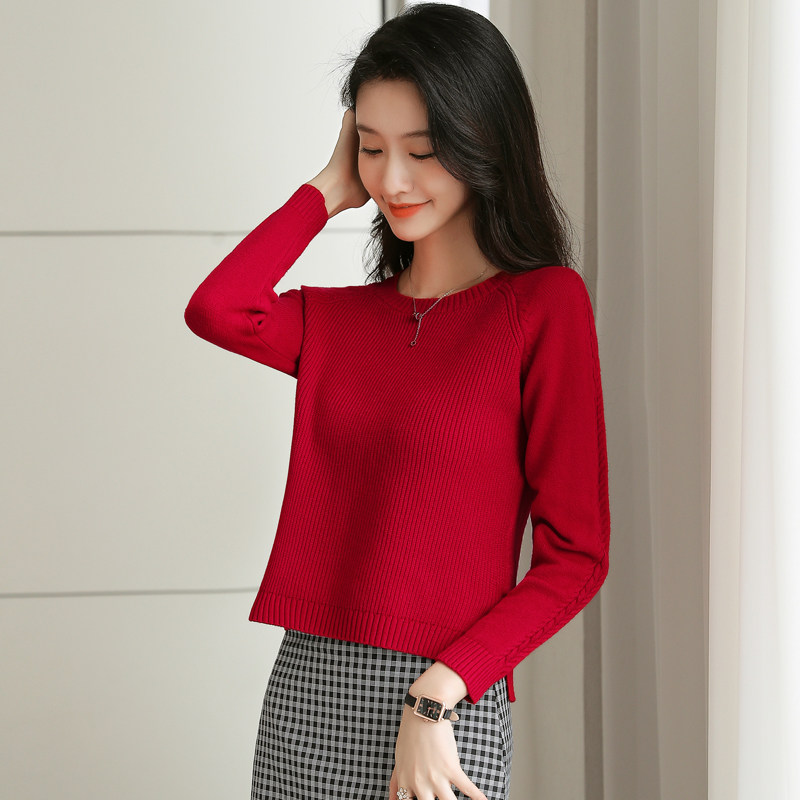 短款毛衣女秋冬女装宽松外穿套头上衣短装圆领开叉高腰打底针织衫