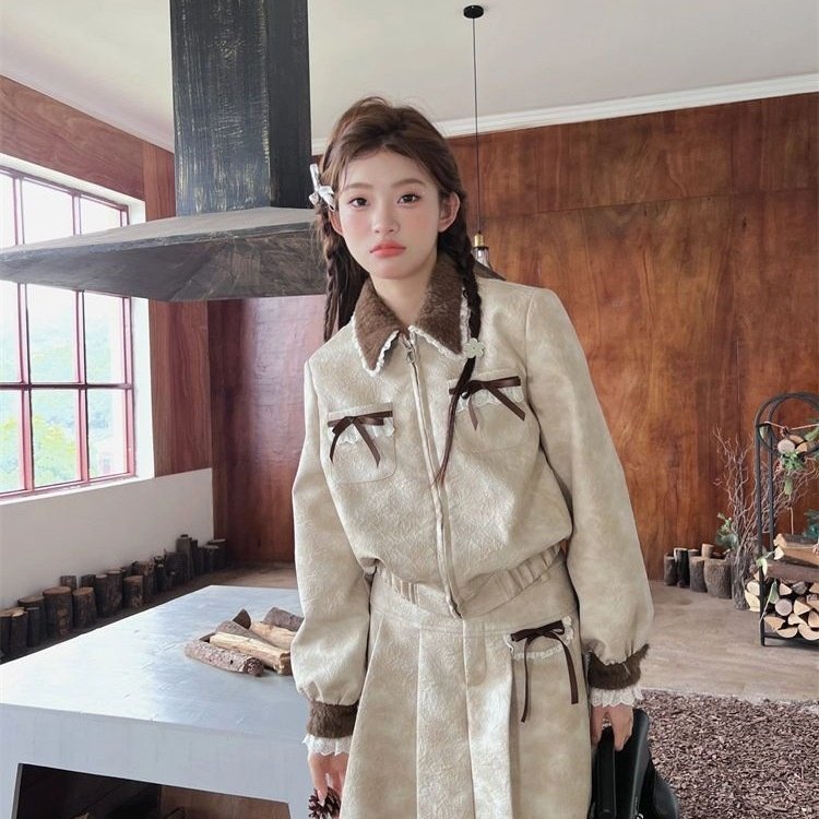 美拉德晕染皮衣套装女秋季小香风外套高腰显瘦新款半身裙两件套装