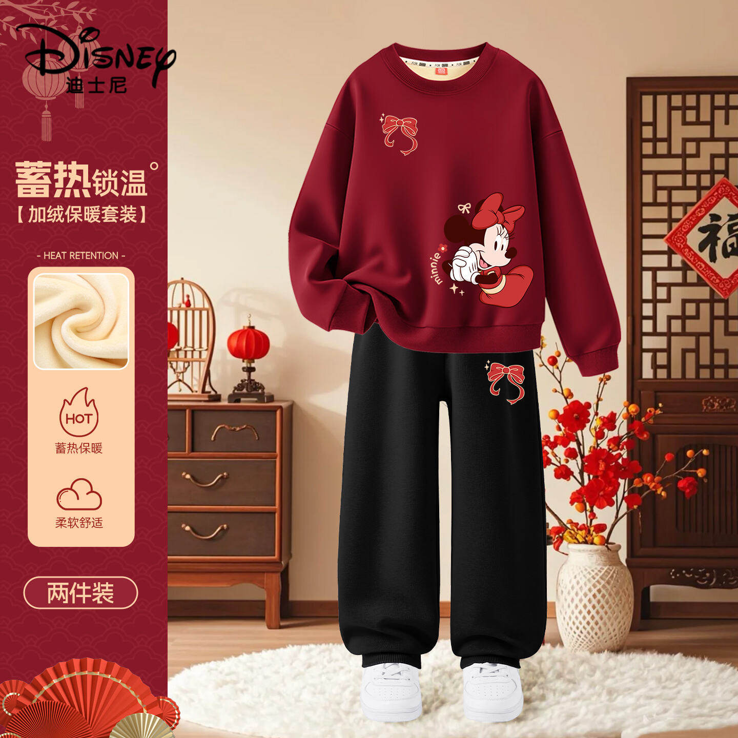 迪士尼童装女童加绒套装拜年服2026新款儿童马年卫衣红色喜庆冬装