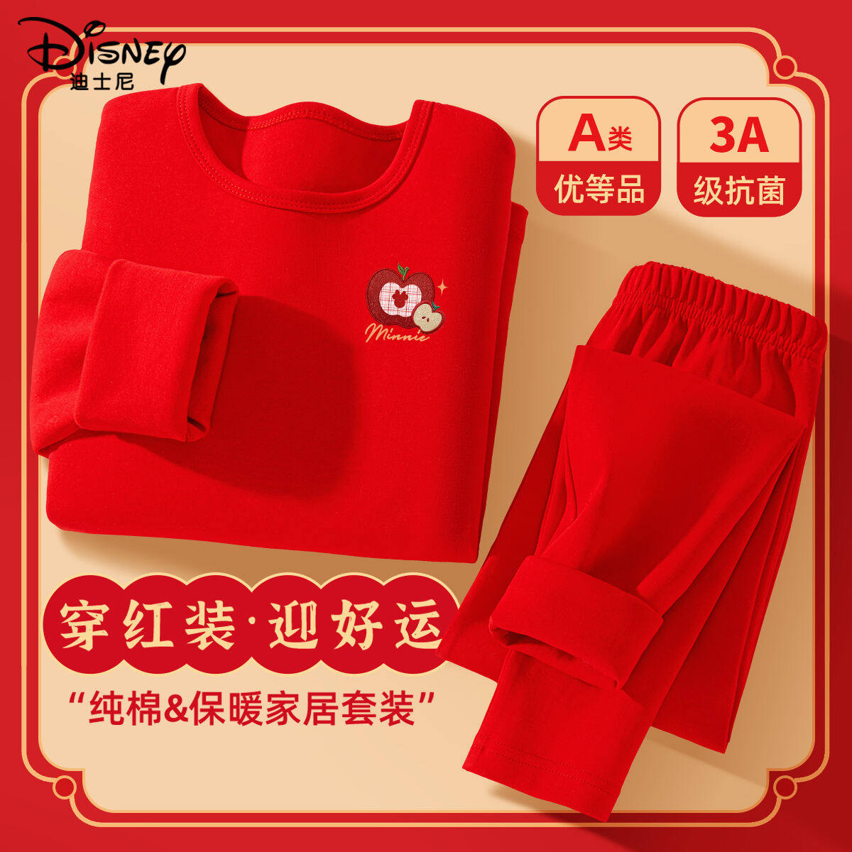 迪士尼童装儿童本命年红色马年睡衣保暖套装女童纯棉秋衣秋裤冬装