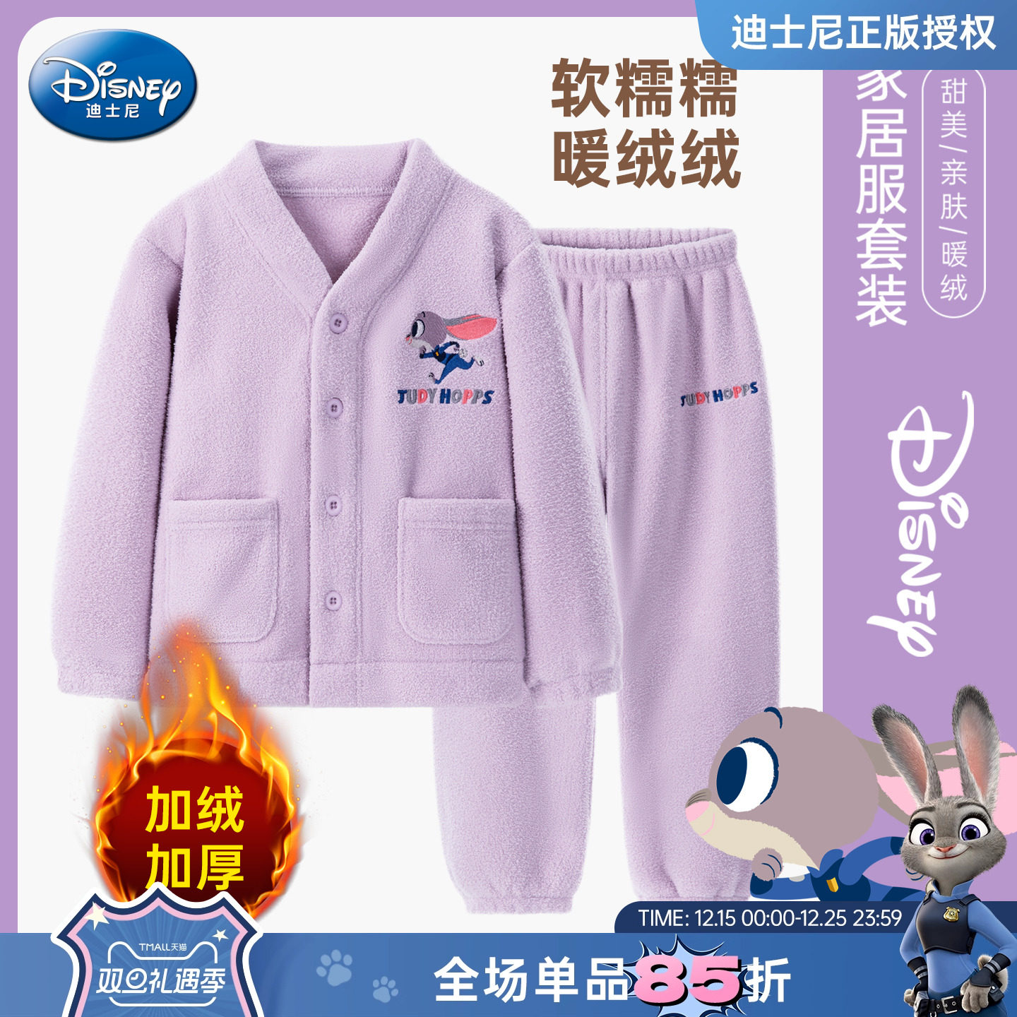 迪士尼童装女童加绒家居服套装2025新款儿童兔子警官双面绒家居服