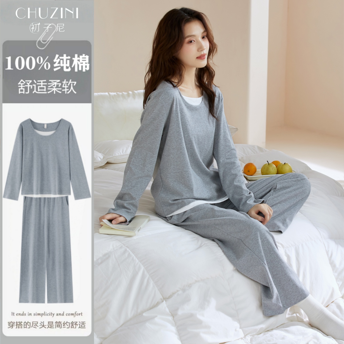 初子尼2025春秋款女士纯棉睡衣套装可外穿假两件柔软长袖薄款