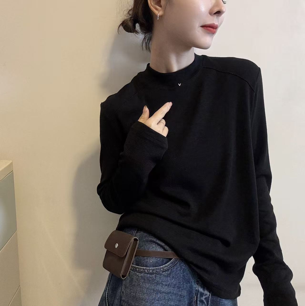 欧洲站2025秋冬气质小立领肩部压线设计V字母定标长袖打底衫T恤潮