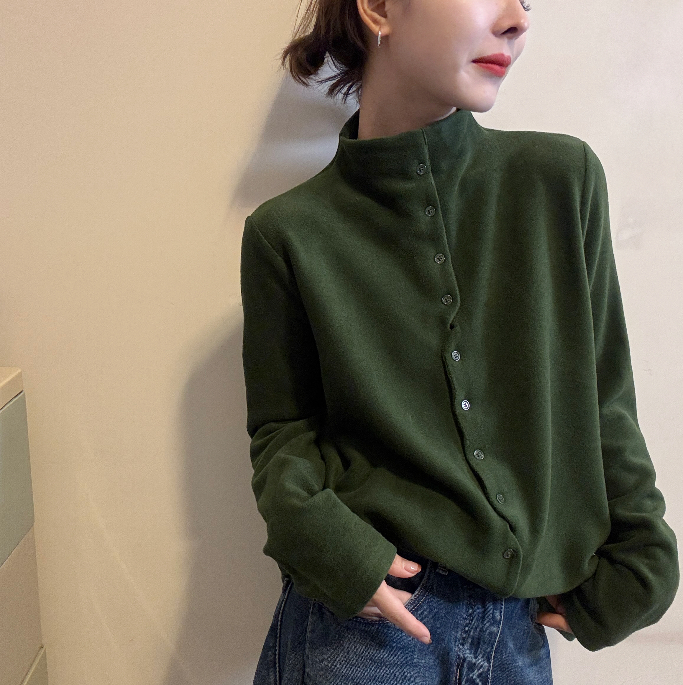 欧洲站2025秋季立领交错排扣宽松加厚德绒糖果色长袖T恤打底 上衣