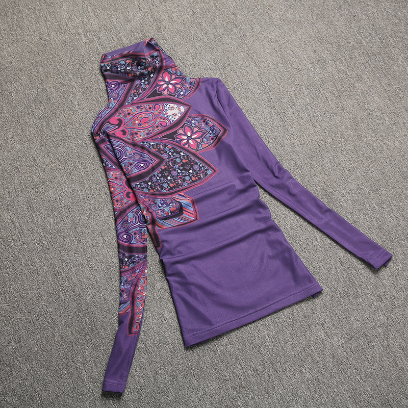 欧洲站2025秋季洋气高领打底衫花色网纱长袖t恤时尚修身紫色上衣