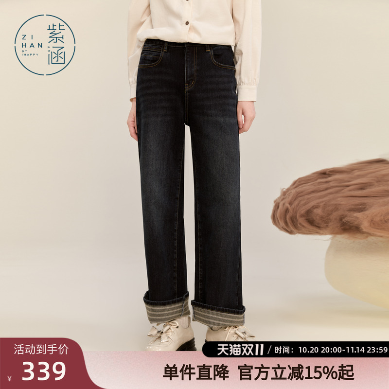 紫涵阔腿直筒牛仔裤女冬季新款复古文艺裤脚撞色宽松高腰休闲长裤