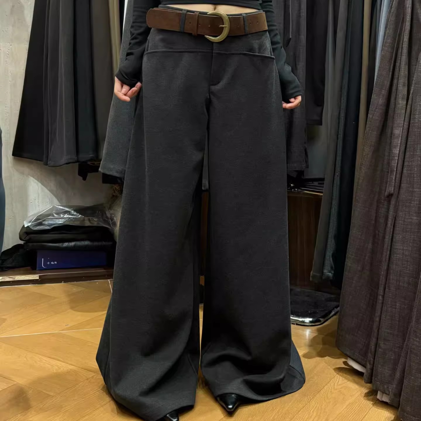 复古深灰加厚毛呢阔腿裤女冬季新款高腰休闲裤褶皱垂感拖地长裤子