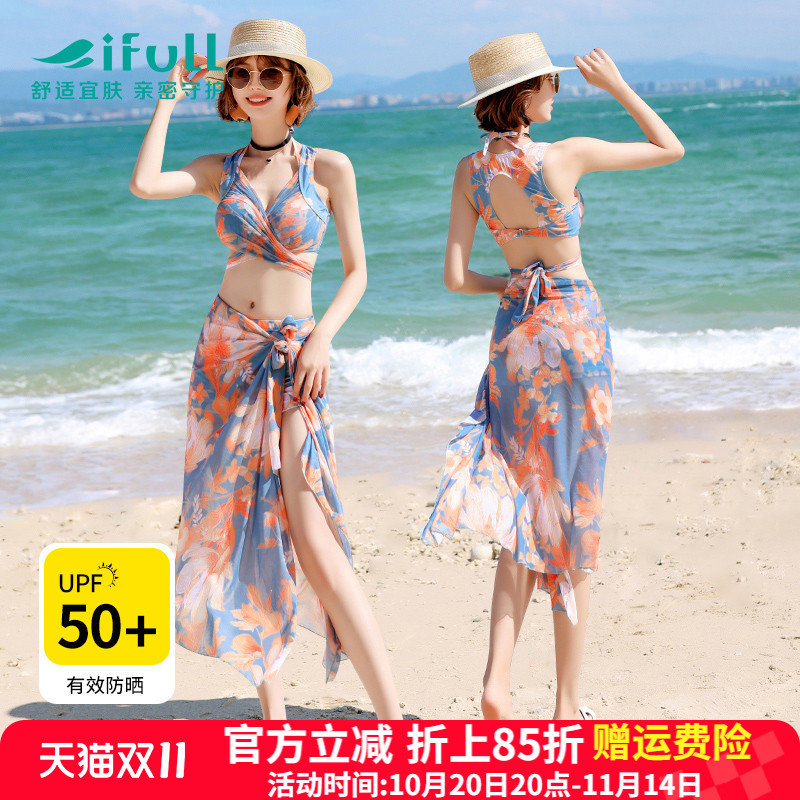 泳衣女高级感纯欲性感长裙比基尼三件套小胸钢托聚拢温泉度假泳装