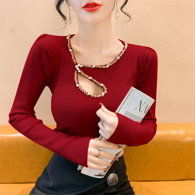 洋气镂空钉钻针织打底衫女秋冬新款2024修身显瘦套头毛衣小衫上衣