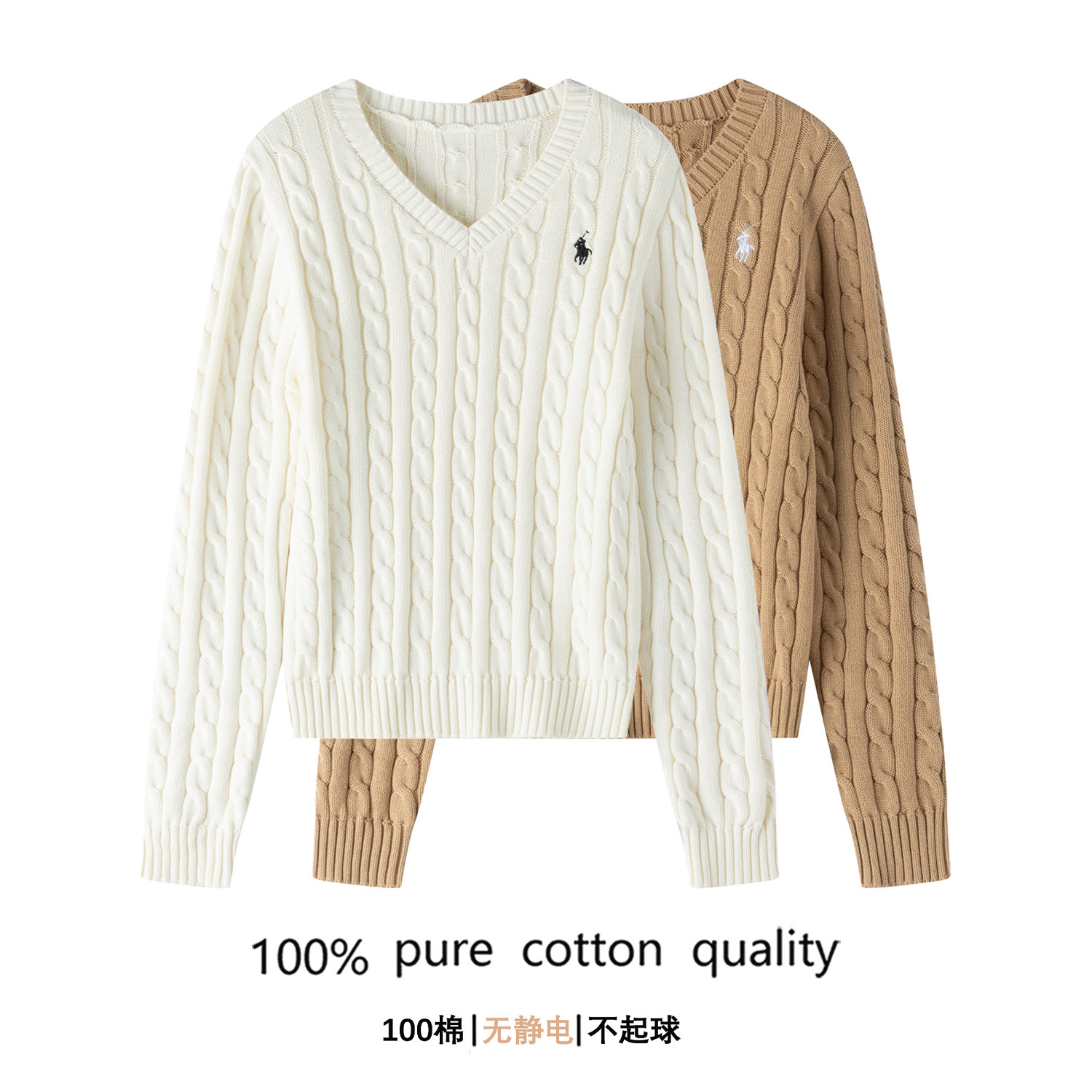 100%纯棉V领麻花纹针织衫女百搭显瘦套头毛衣休闲2025秋冬穿搭