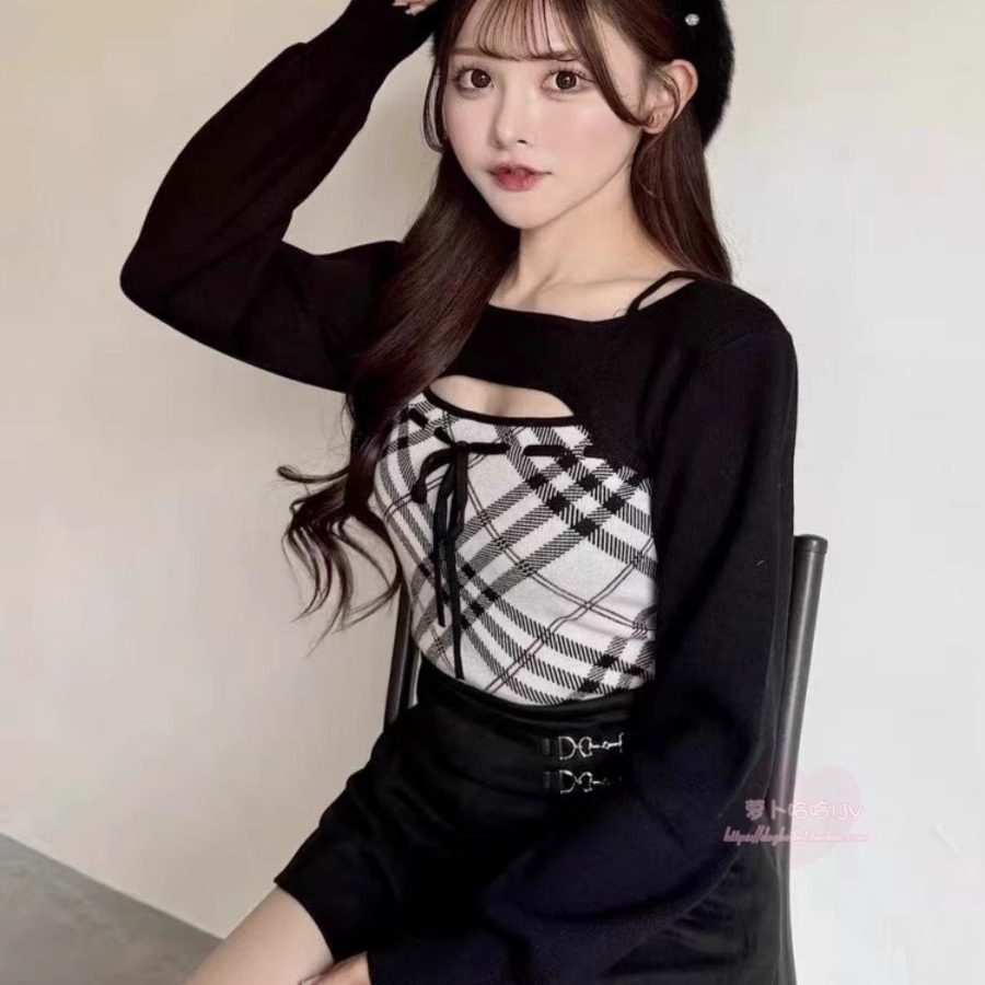 纯原!n0m@e小众设计 假两件格纹拼接系带镂空显瘦套头毛衣针织衫