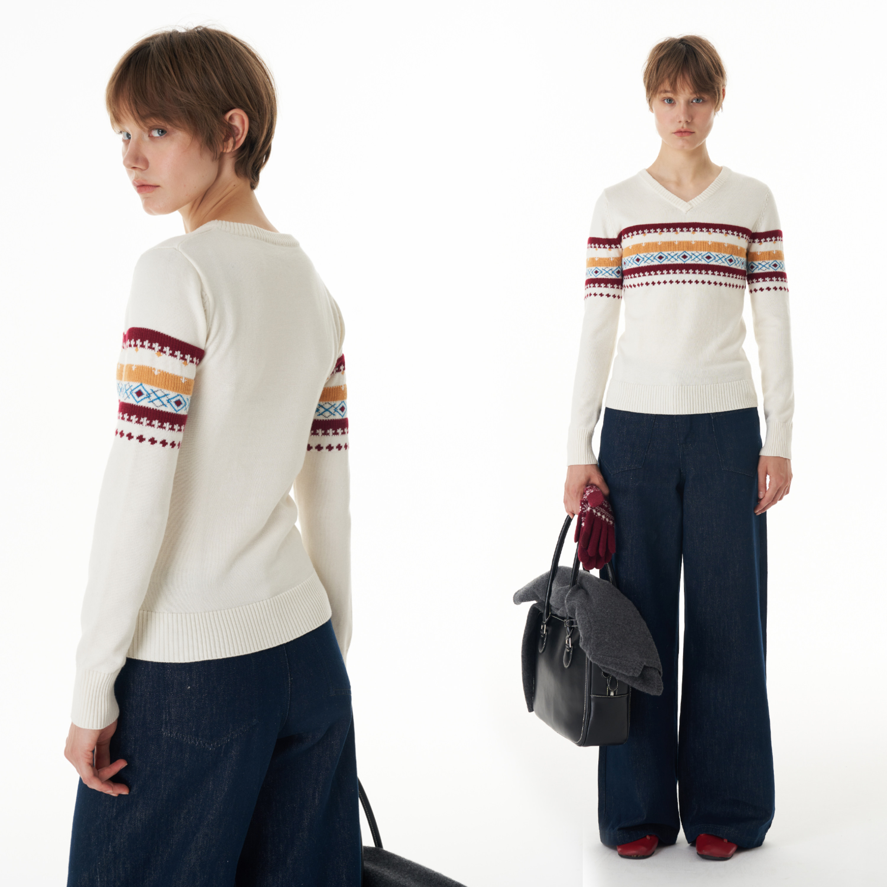 SEEKSIMPLE 多色提花V领羊毛针织衫修身显瘦套头毛衣女2024秋冬