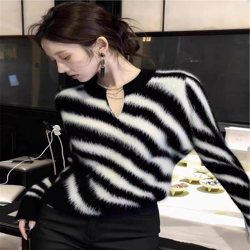 专柜撤回黑白条纹针织衫女简单大方高级感慵懒风百搭显瘦套头毛衣