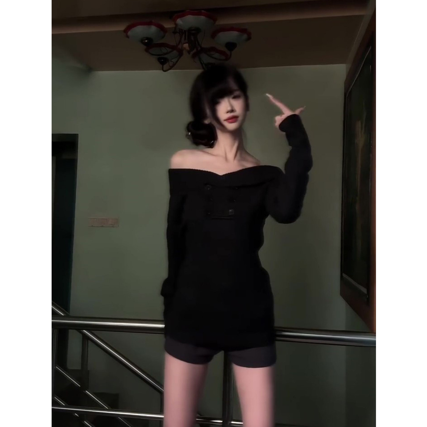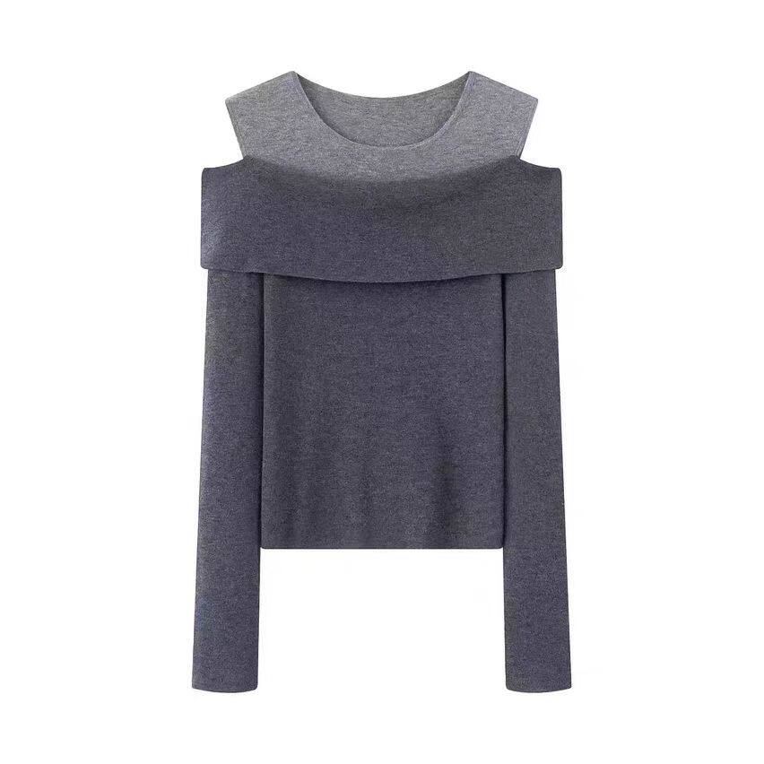 韩系气质一字肩深花灰软糯针织衫女秋冬新款辣妹露肩显瘦套头毛衣