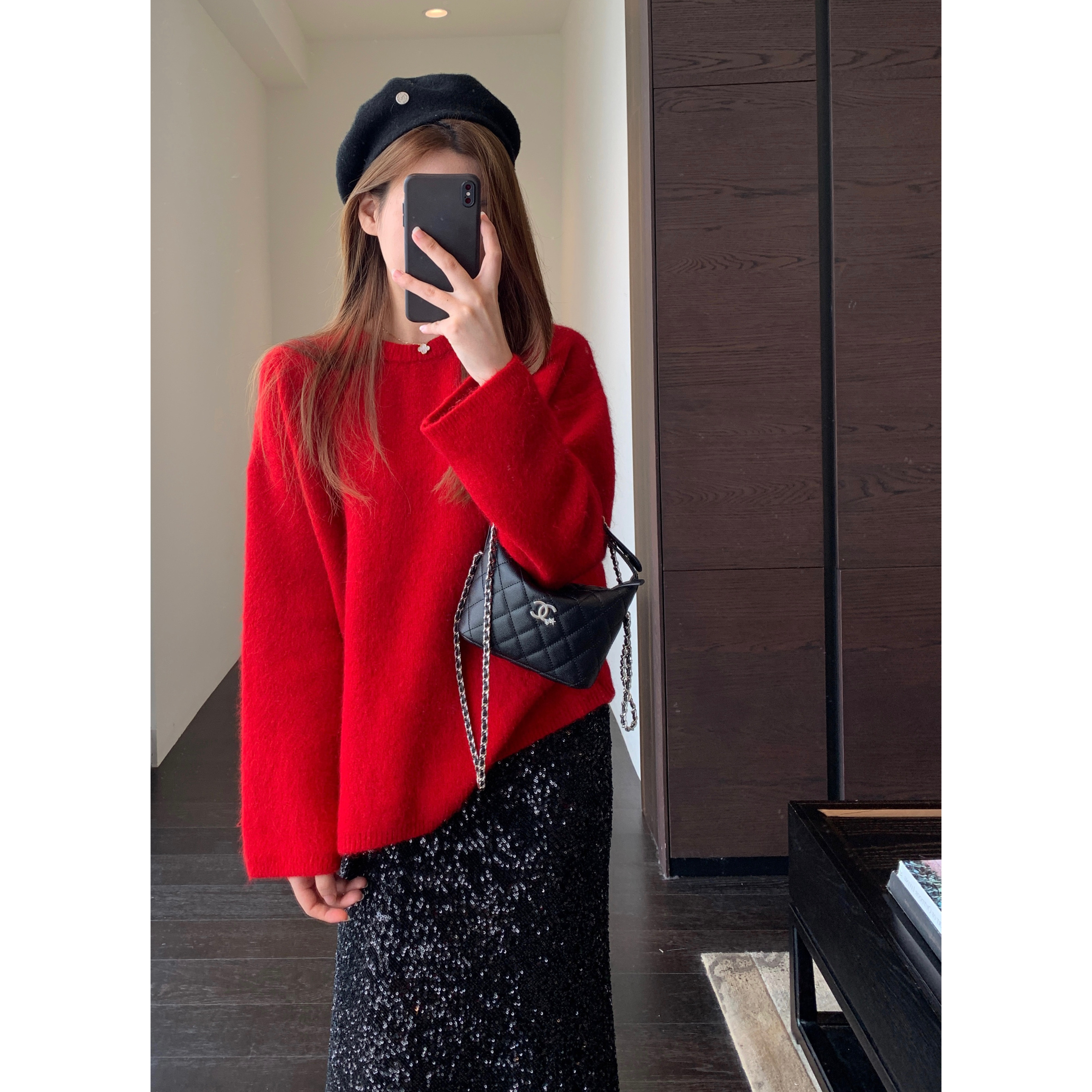 美翻N倍~ 100%山羊绒新年红撞色字母针织衫立领显瘦套头毛衣