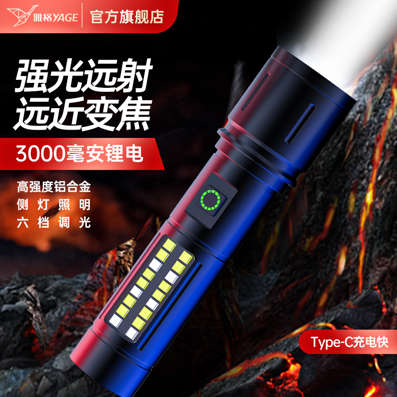 雅格铝合金手电筒强光远射调焦超亮户外小型便携充电款2025年新品
