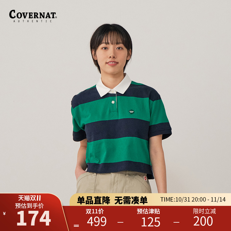 covernat韩国潮牌夏季女士露脐橄榄球poloT恤短袖短款显瘦条纹