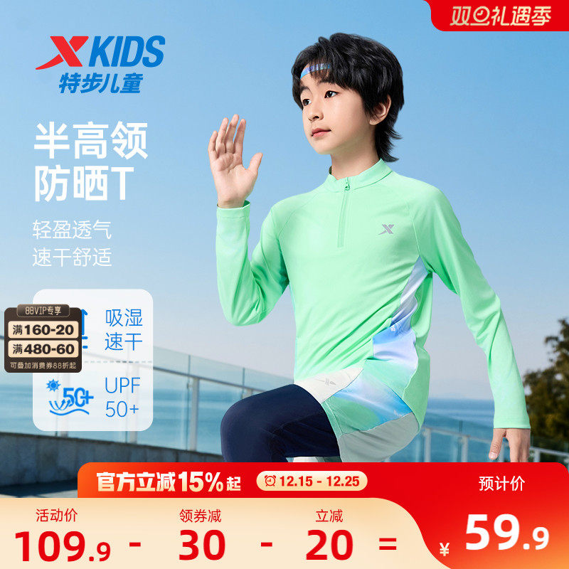 特步童装夏季款中大童透气速干儿童半开襟防晒T恤男童长袖针织衫