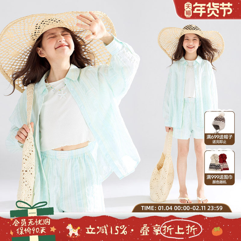 女童防晒衫套装儿童夏季薄款衬衫背心短裤三件套2025新款大童衣服