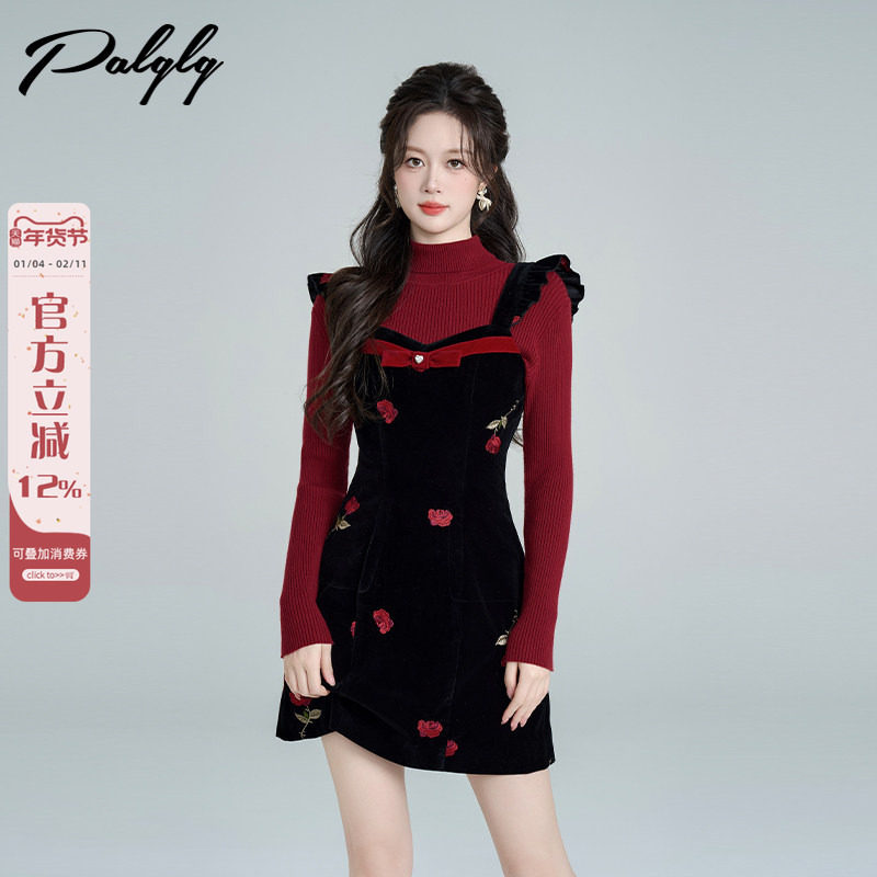 Palglg小香风飞飞袖背带丝绒连衣裙女冬季高级感法式收腰玫瑰裙子