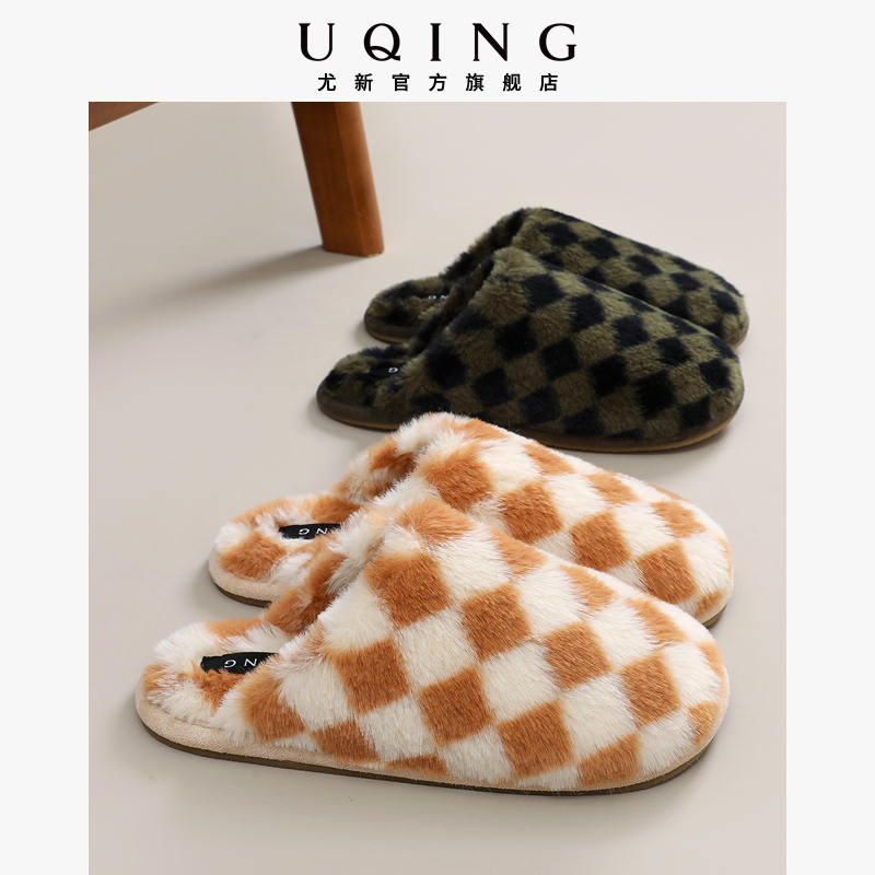 出口女士秋冬保暖格子拖鞋加厚底防滑兔毛绒包头居家用时尚棉拖鞋