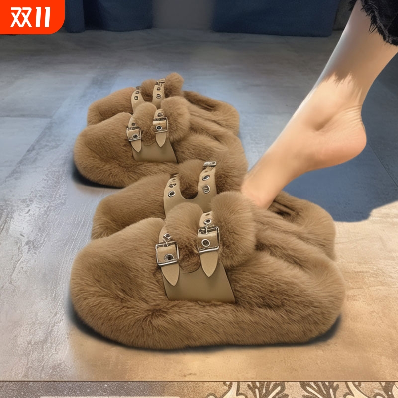 爆款毛毛拖鞋女冬季外穿2025新款兔毛高级感网红厚底毛绒棉拖春秋