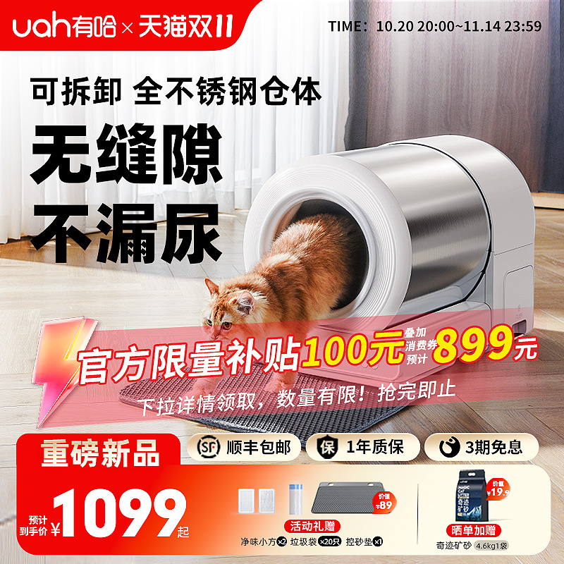 【新品】 uah有哈不锈钢全自动猫砂盆电动智能猫厕所铲屎封闭防臭