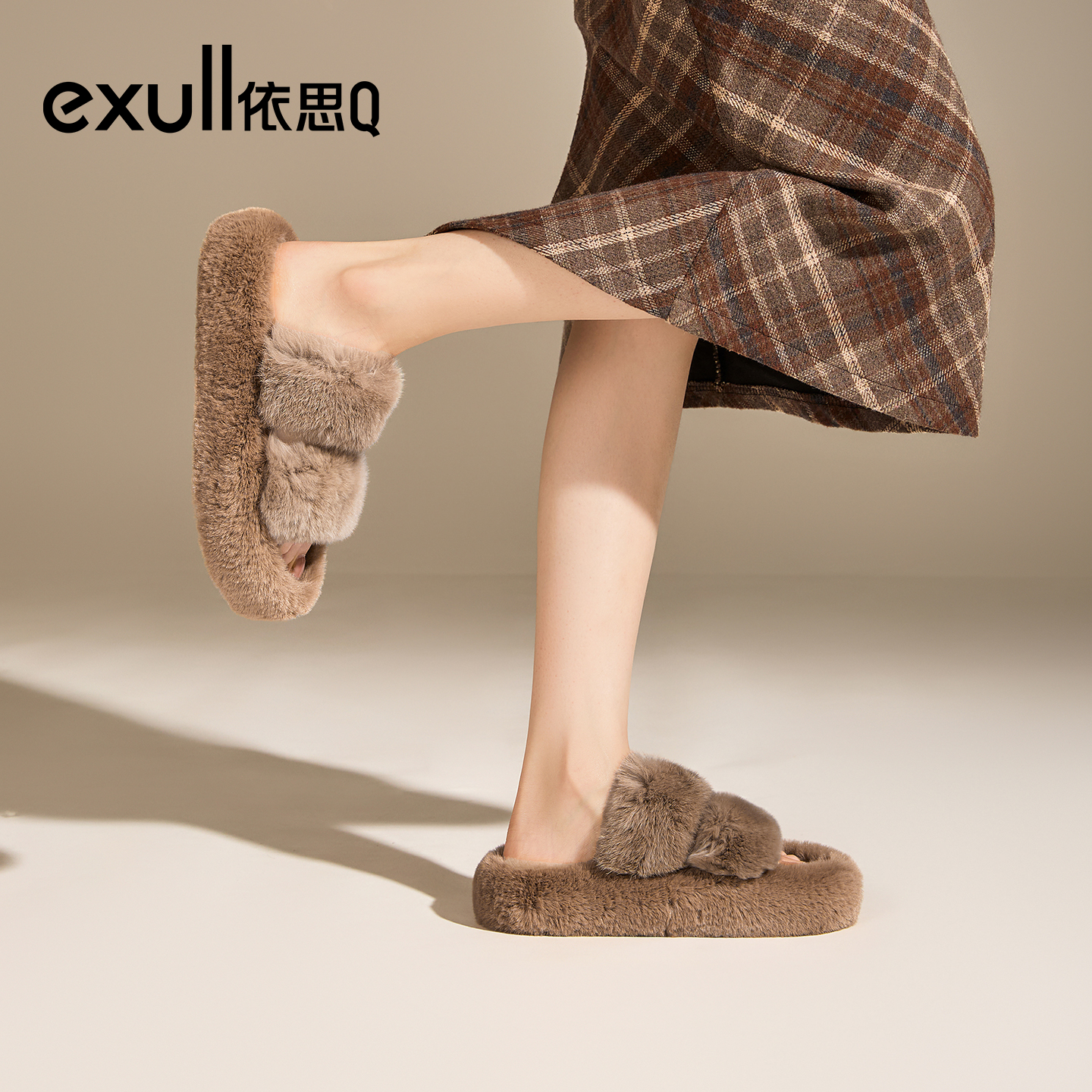 exull/依思Q2025秋冬新款毛毛拖鞋女外穿毛绒单鞋一字拖厚底拖鞋