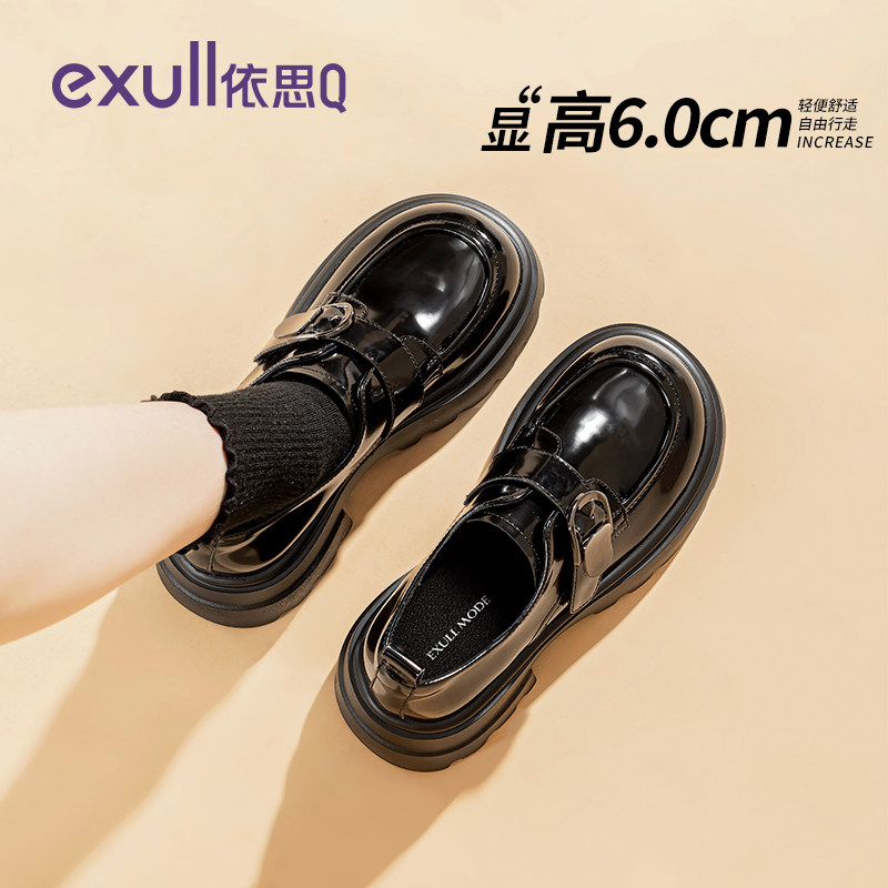 依思q厚底乐福鞋女款2026春秋新款单鞋英伦风小皮鞋增高黑色女鞋