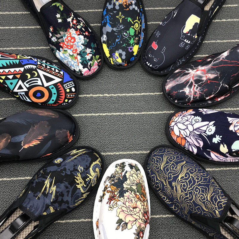 春夏季老北京款花布鞋男龙图案刺绣民族风社会一脚蹬板鞋平跟百搭