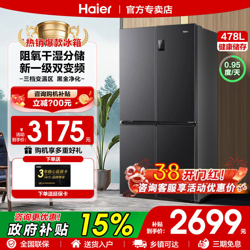 [换新补贴]海尔478L四门十字双对开门家用变频一级能效无霜电冰箱