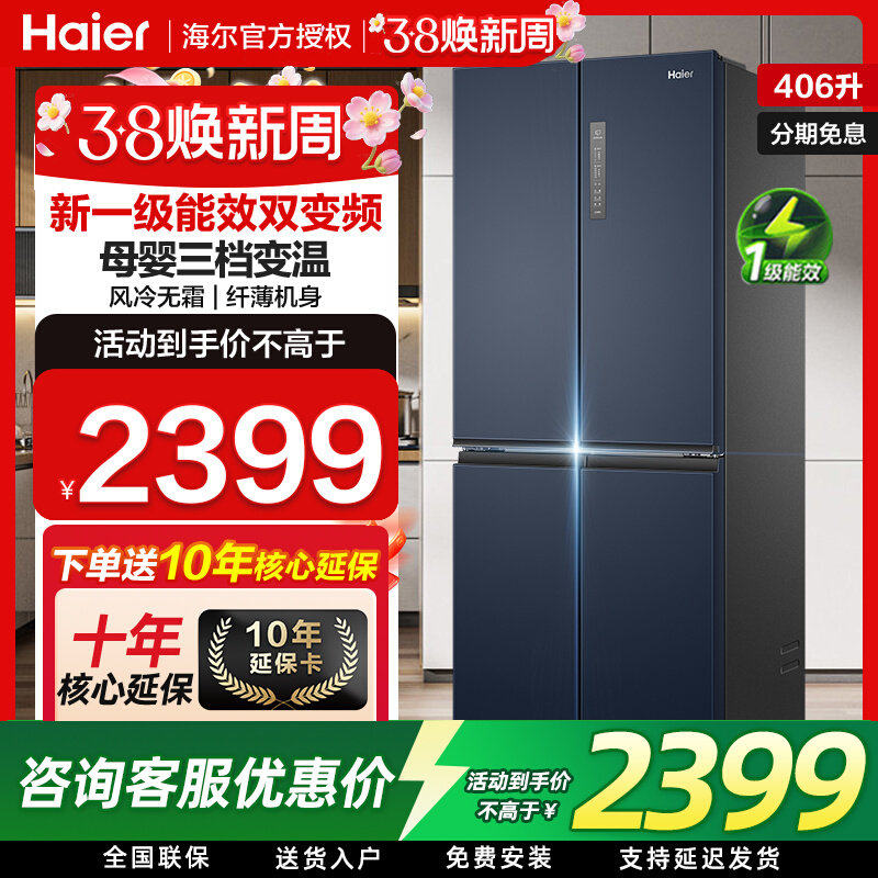 海尔电冰箱406升一级能效家用十字对开门四门变频无霜大容量旗舰