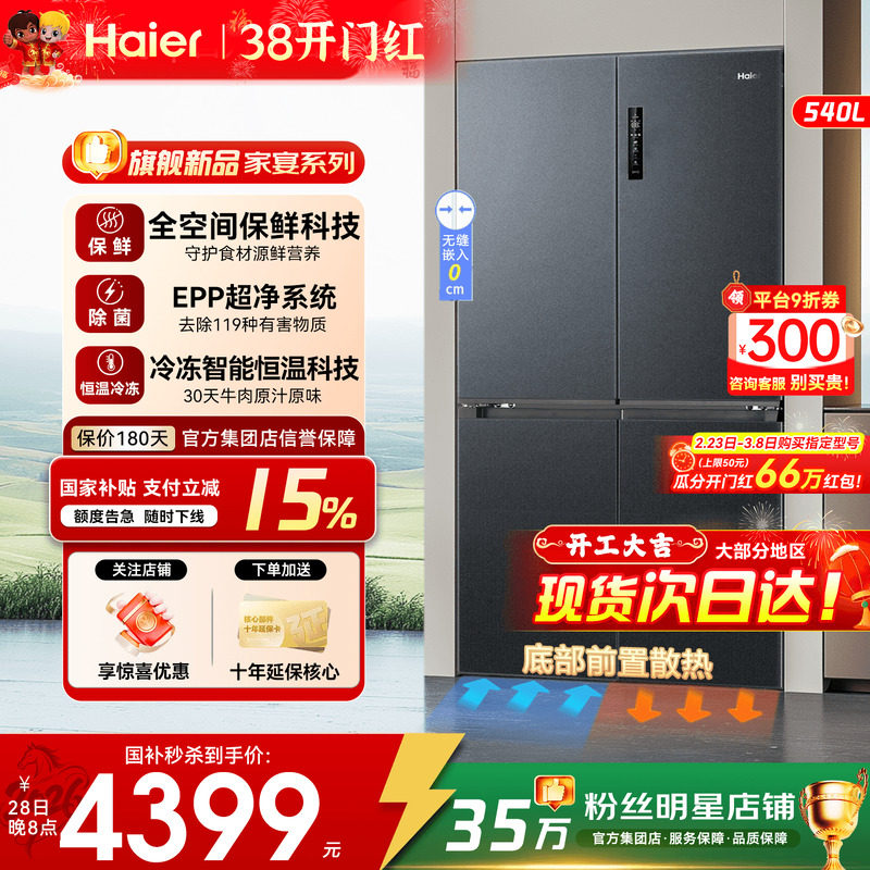 【国补15%】海尔冰箱540升零嵌家用十字对开门一级变频全空间保鲜