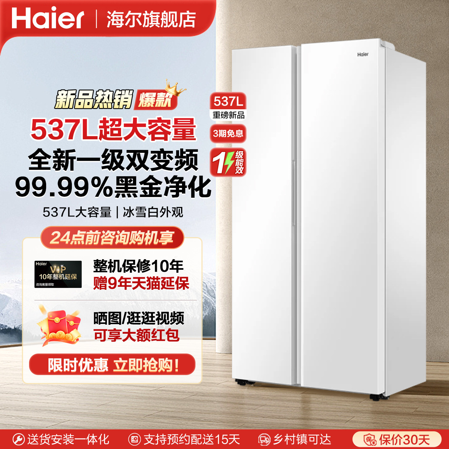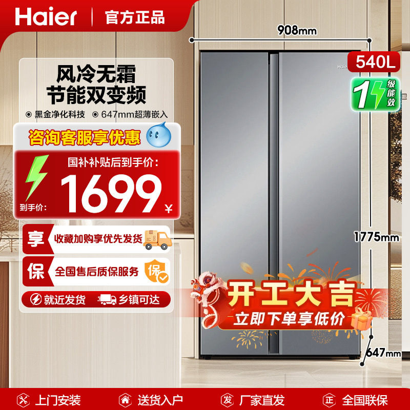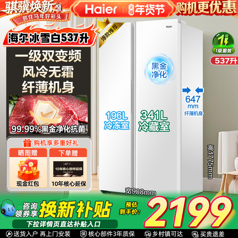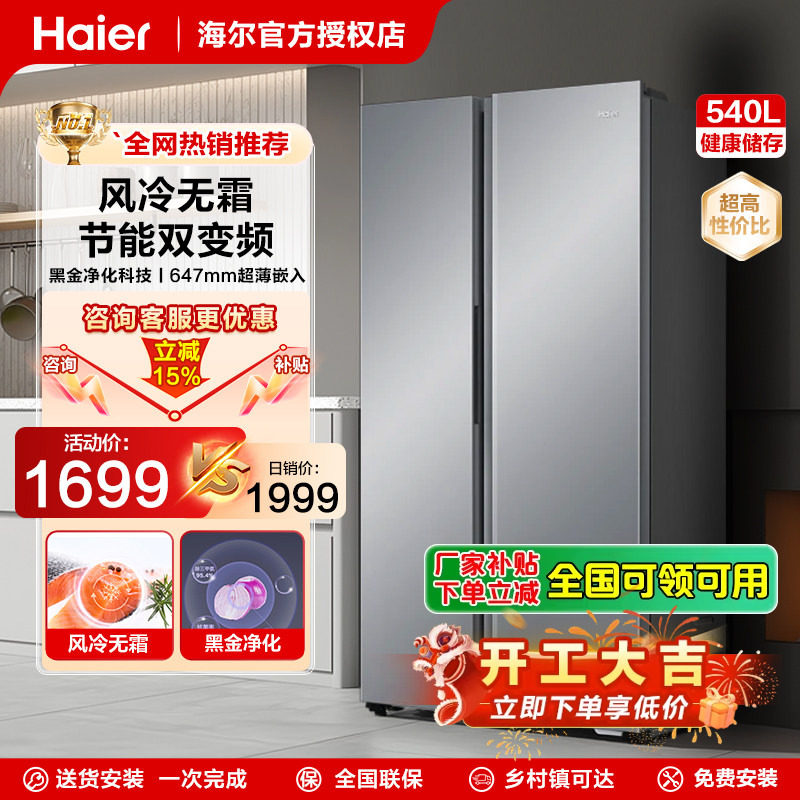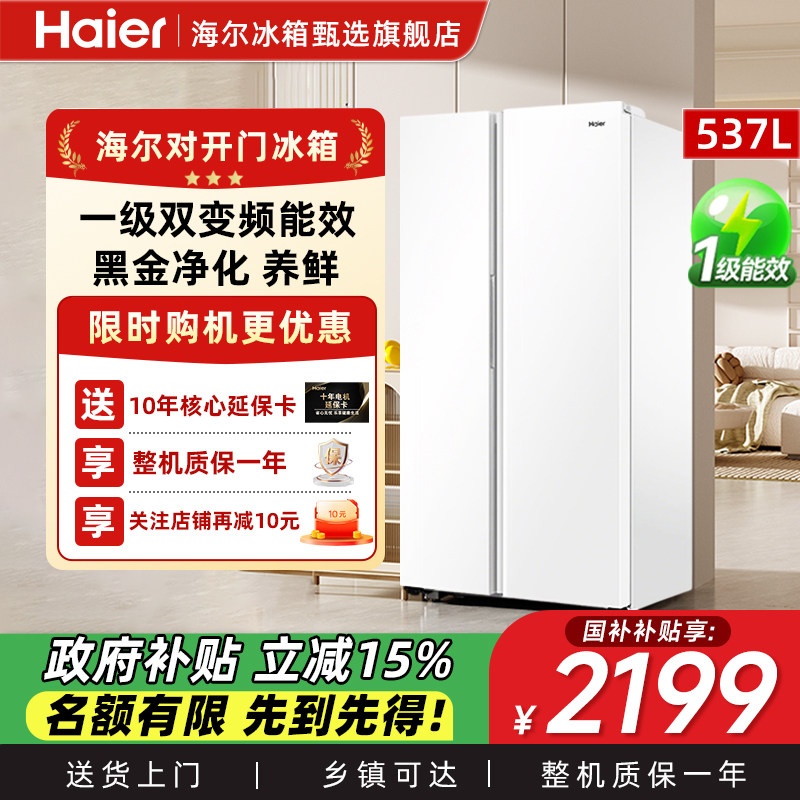 海尔537L对开门双门大容量电冰箱家用变频一级能效大容量风冷无霜