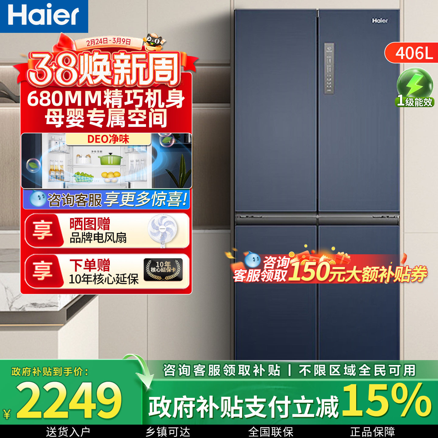Z国家补贴海尔418升超薄零嵌十字对开门家用大容量电冰箱一级变频