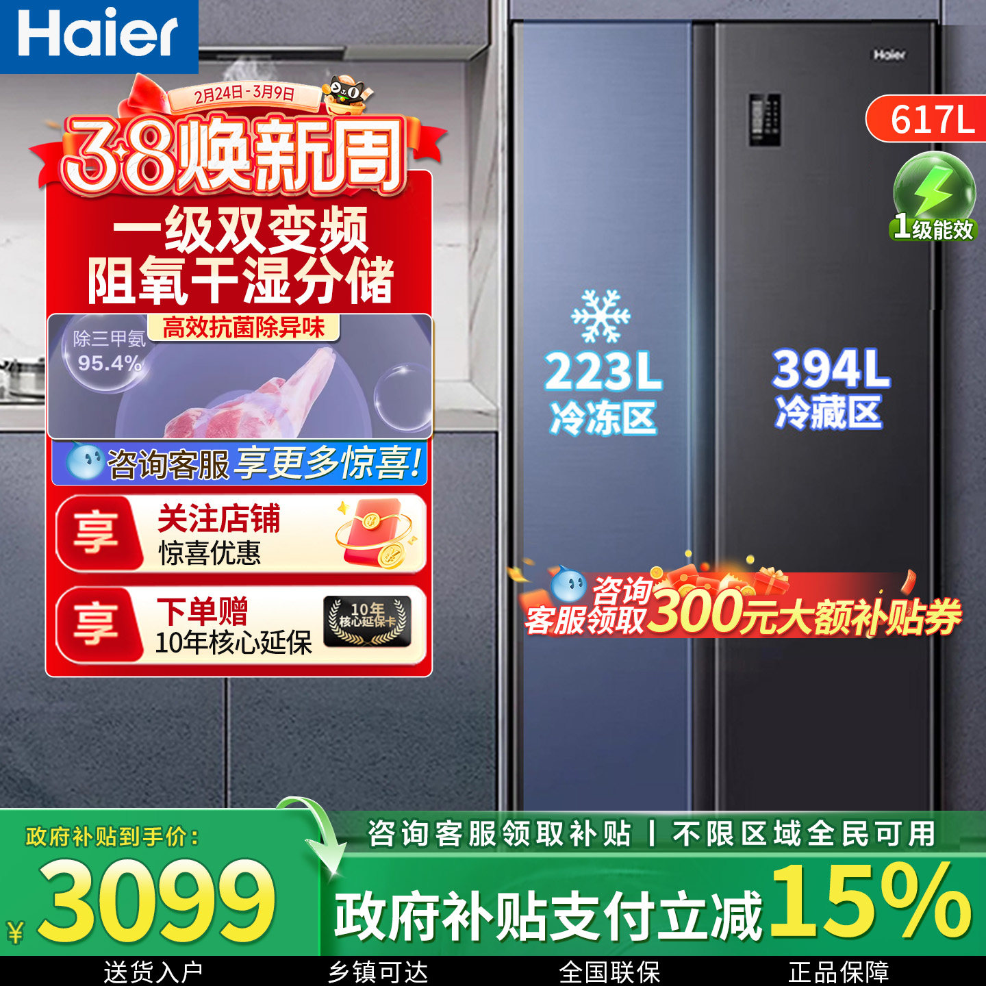 国补海尔电冰箱617升一级能效家用对双开门大容量双变频风冷无霜