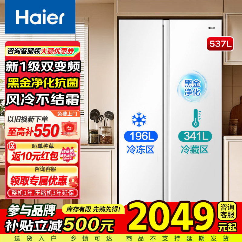 海尔538/537L双开门电冰箱对开门家用一级能效变频大容量风冷无霜