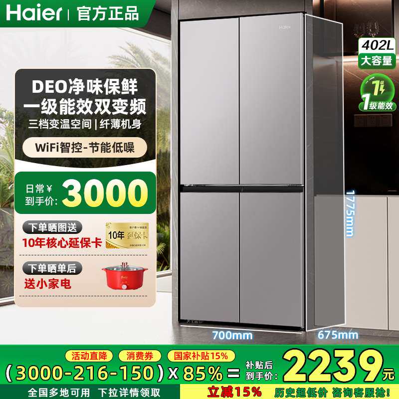 【新品】海尔冰箱家用402升十字对开门一级能效无霜双变频超薄