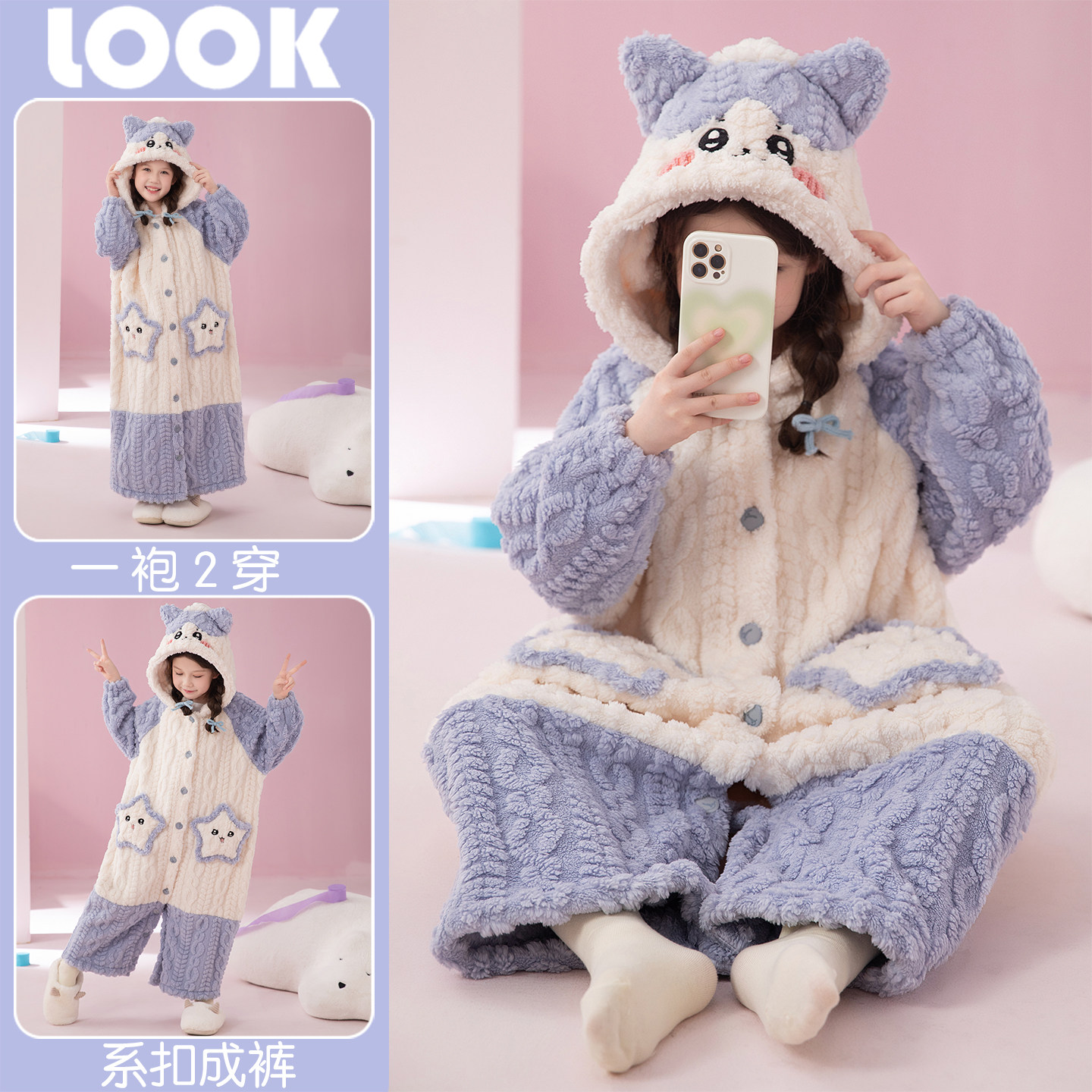 儿童睡袍玉桂狗加绒加厚睡衣女童秋冬珊瑚绒可外穿家居服套装浴袍
