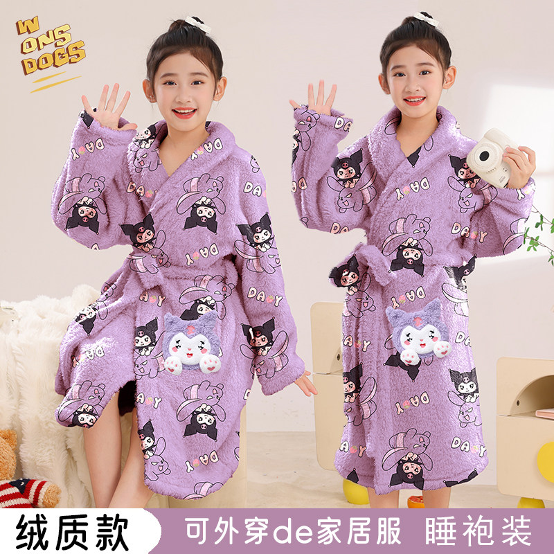 库洛米儿童浴袍女童珊瑚绒睡袍冬保暖法兰绒男孩大童亲子浴巾睡衣