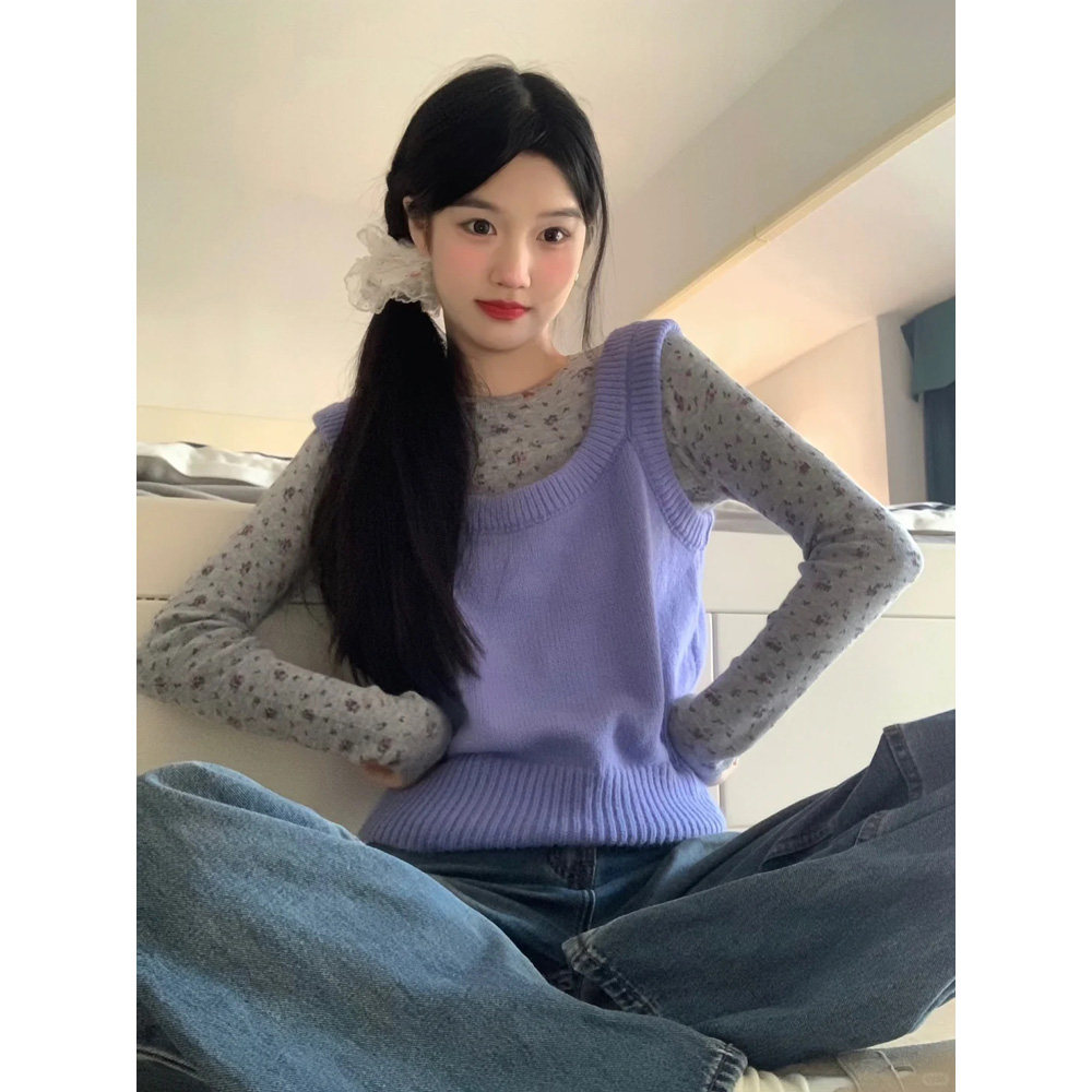 自制日系甜美风蓝紫色套头无袖毛衣女春少女感短款针织衫马甲背心