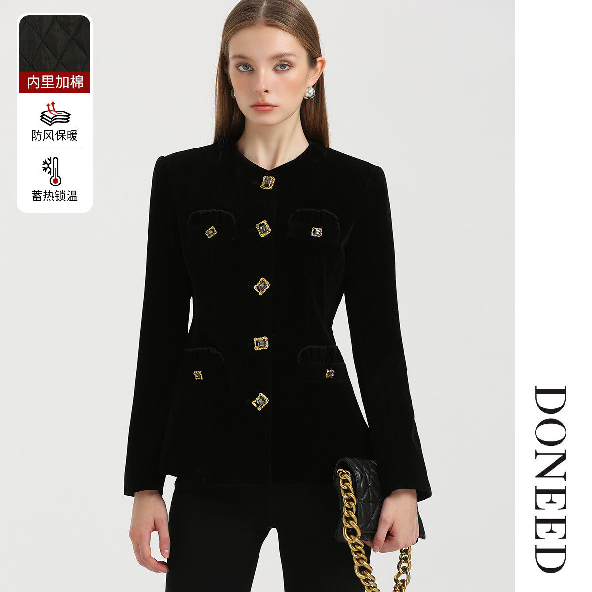 DONEED春秋款复古气质宫廷名媛收腰显瘦丝绒夹棉保暖黑色外套女